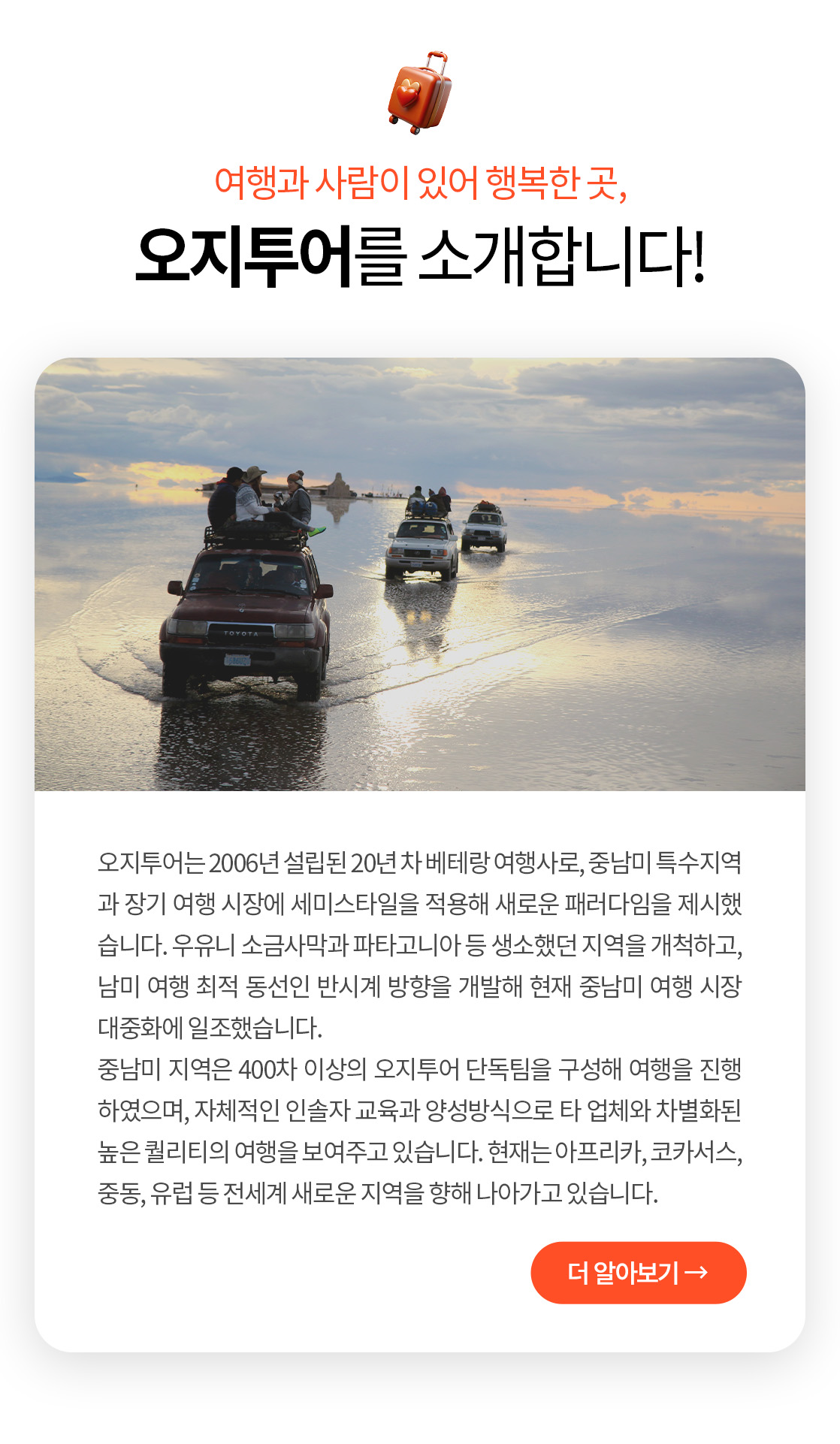 "항공료 변동 등의 이슈로 남미 여행은 가장 먼저 예약하신 분이 제일 저렴하게 여행합니다! 고민 중이신가요? 지금 바로 예약하세요!"