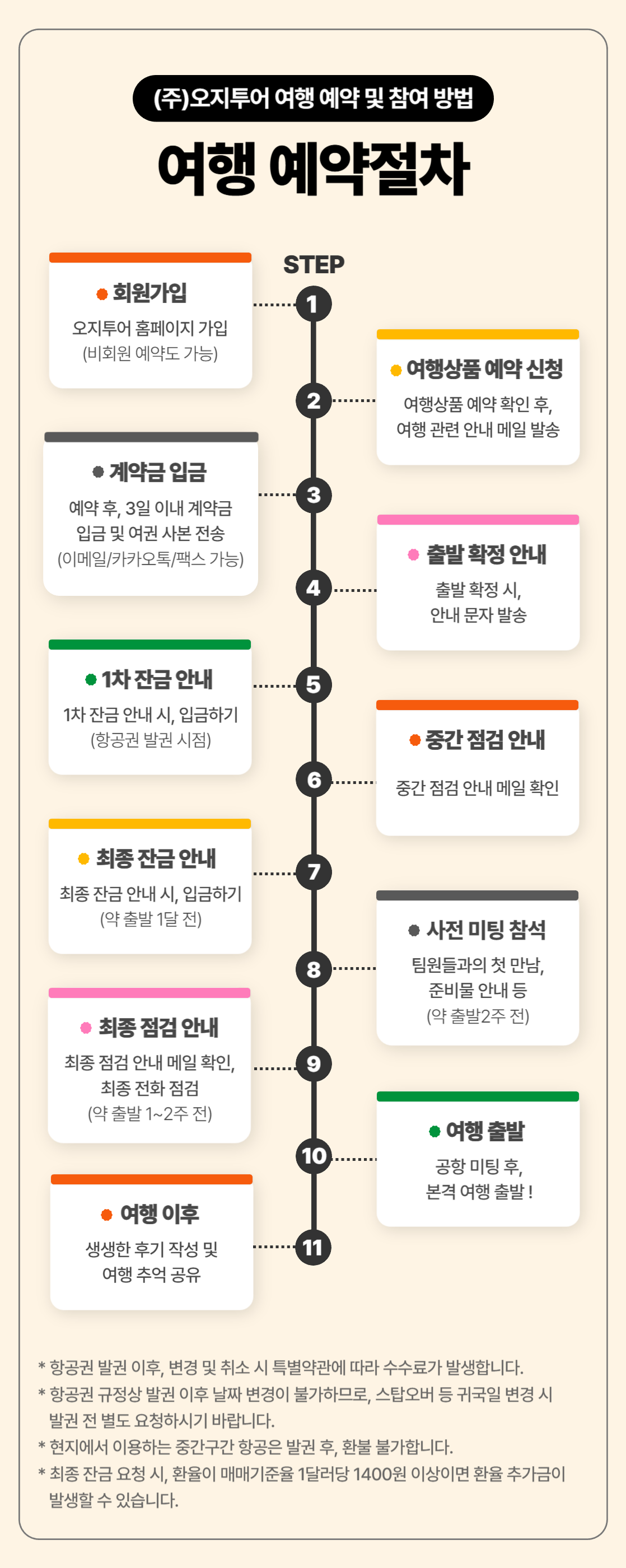 - 항공권(E-ticket) 수령 후, 영문 이름, 날짜 등 세부 사항을 반드시 직접 확인하시고, 오류가 있을 경우 즉시 오지투어로 연락해 주시기 바랍니다.