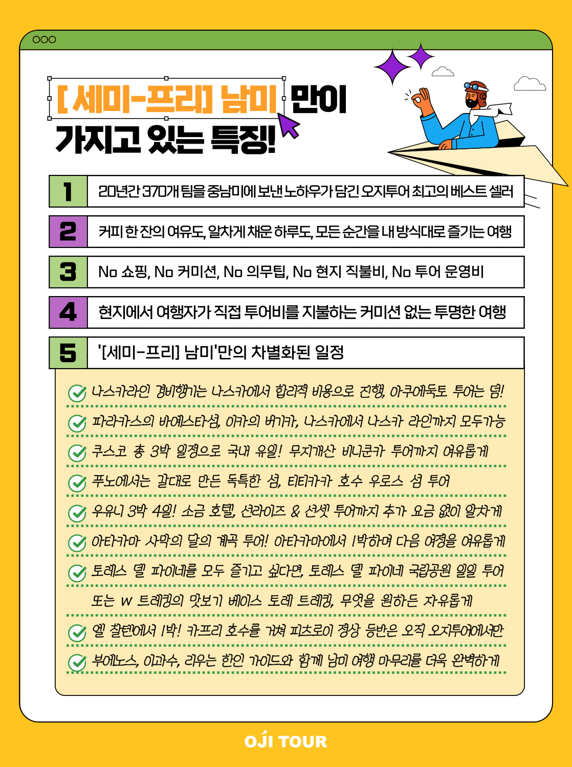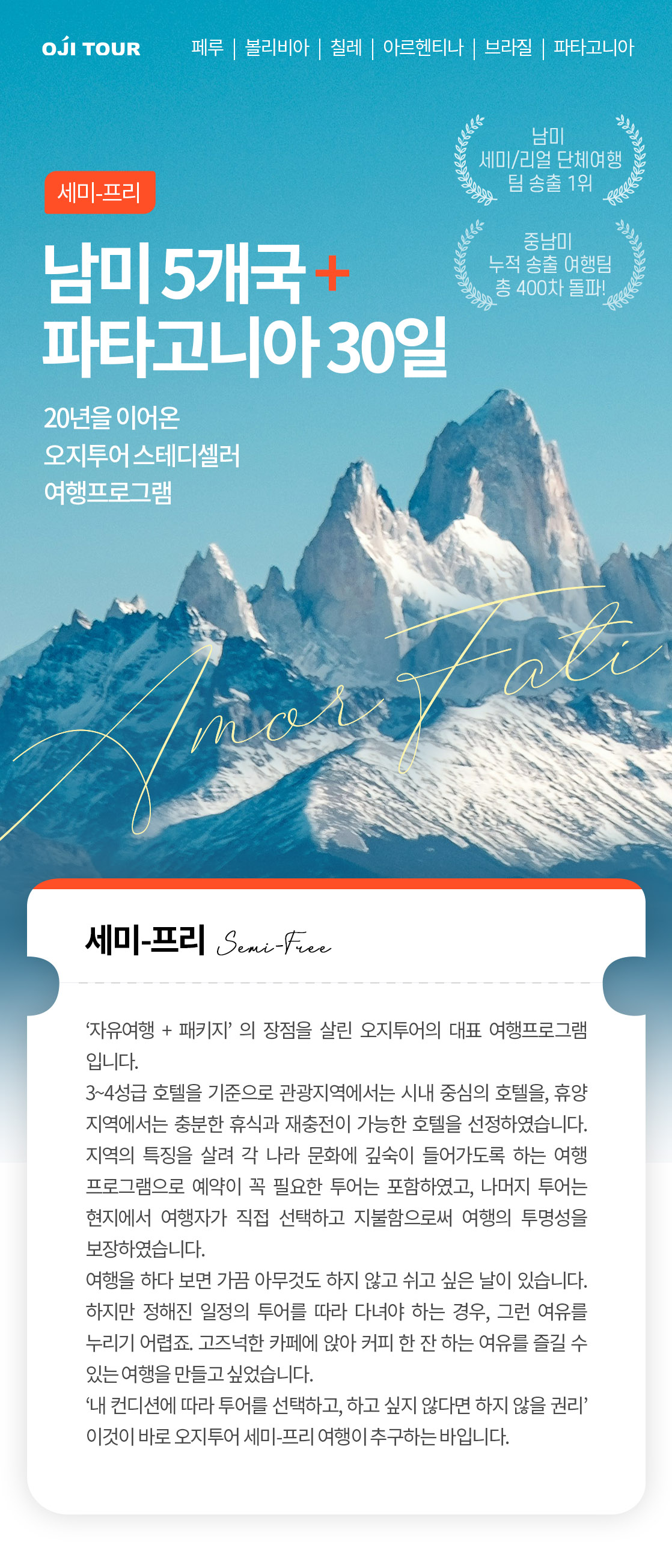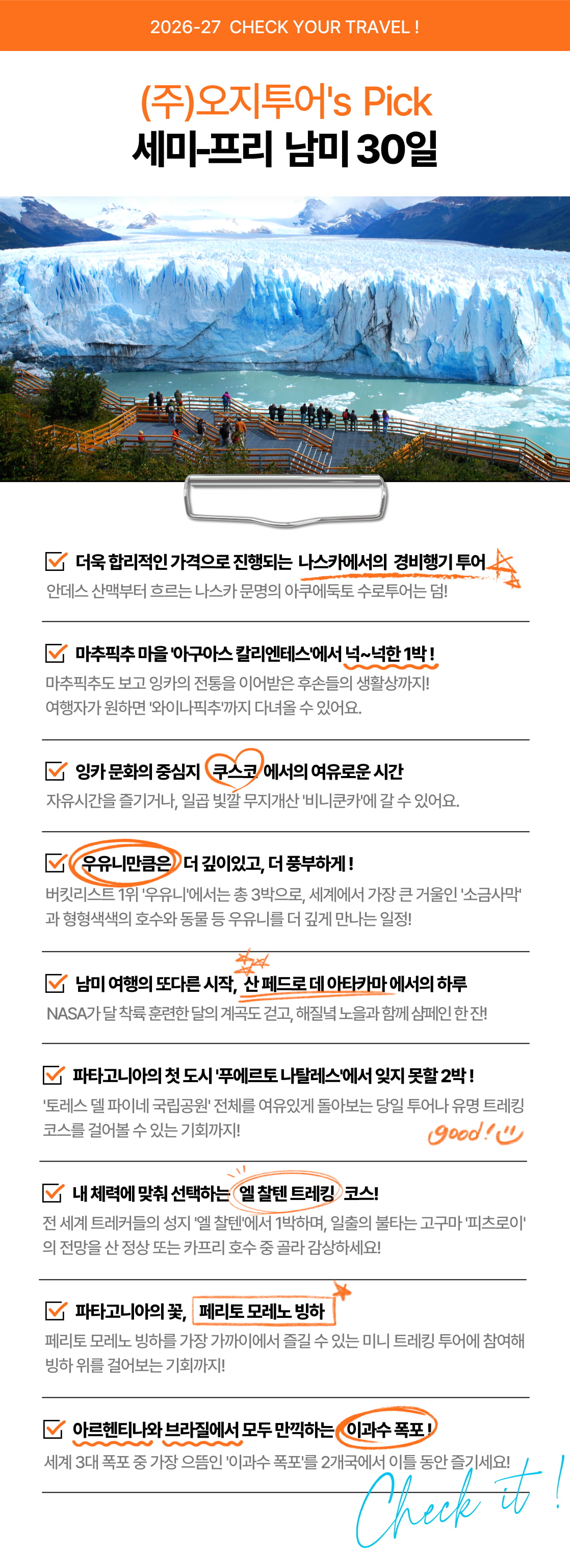 ※ 남미 여행은 특수 지역입니다. 항공 변동이 잦은 편이므로, 출발일 변동이 있을 수 있습니다.