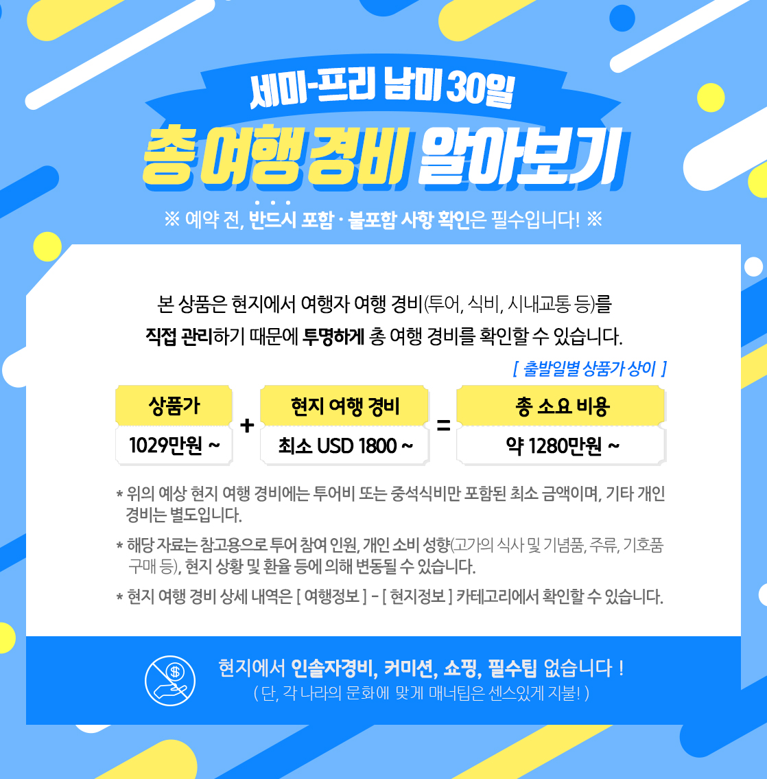 ◆ 출발 전 안내해 드리는 현지 여행 경비는 최저 예상 비용이며, 현지 물가 인상 및 개인의 소비 형태에 따라 상이해질 수 있음을 인지하시기 바랍니다.