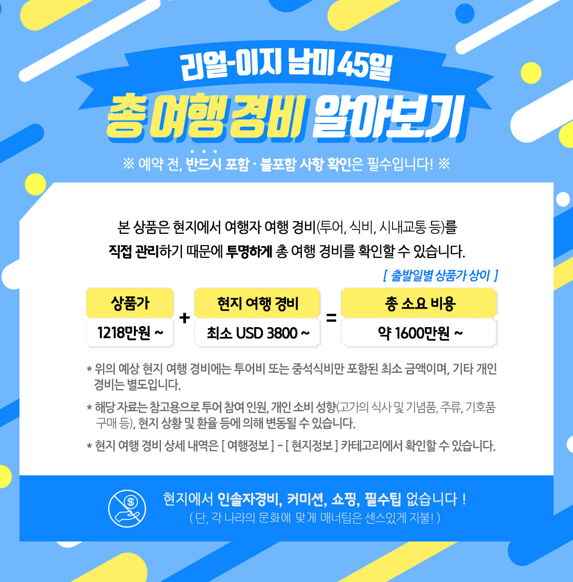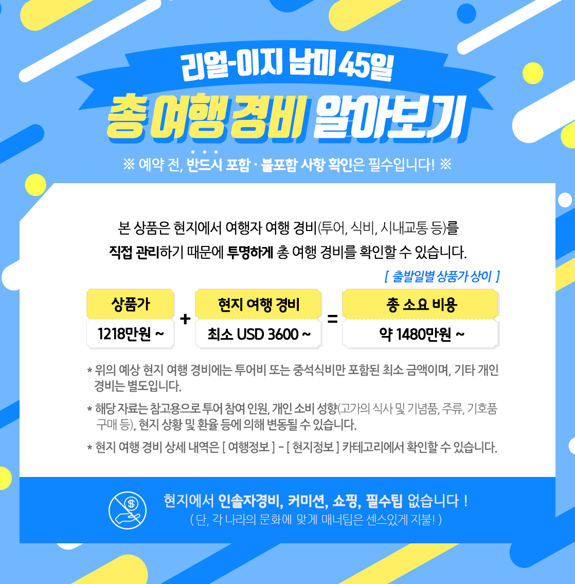 ◆ 출발 전 안내해 드리는 현지 여행 경비는 최저 예상 비용이며, 현지 물가 인상 및 개인의 소비 형태에 따라 상이해질 수 있음을 인지하시기 바랍니다.